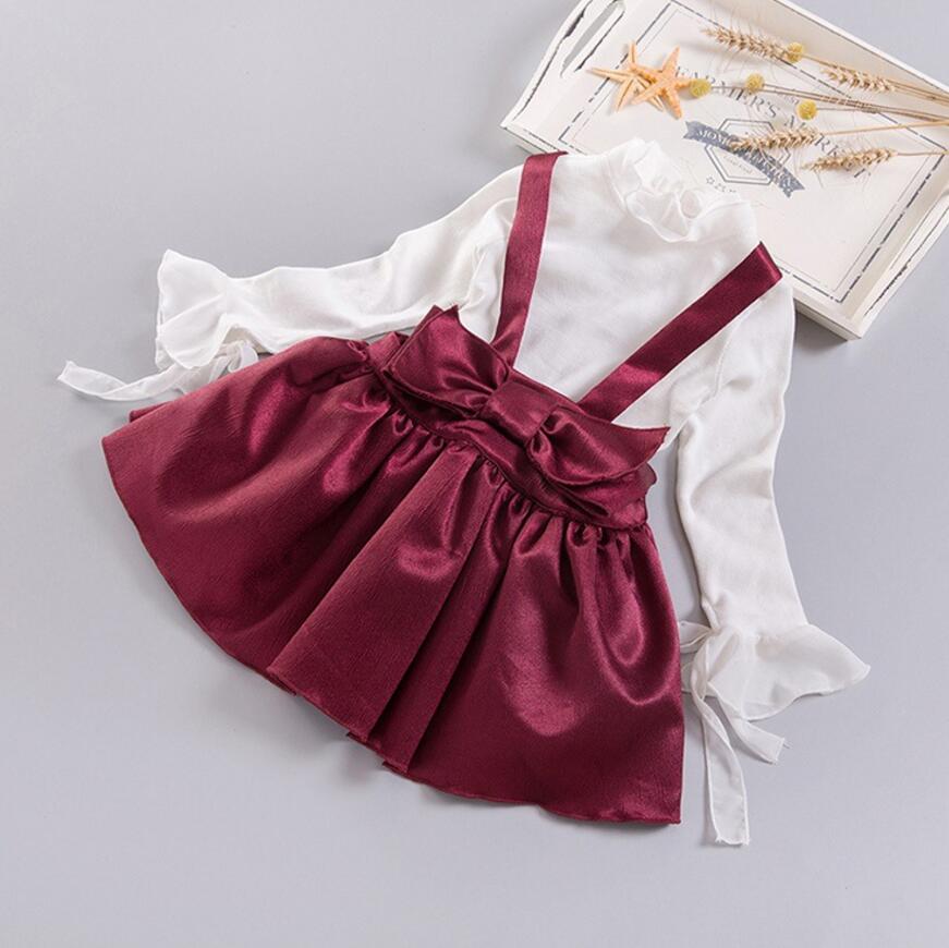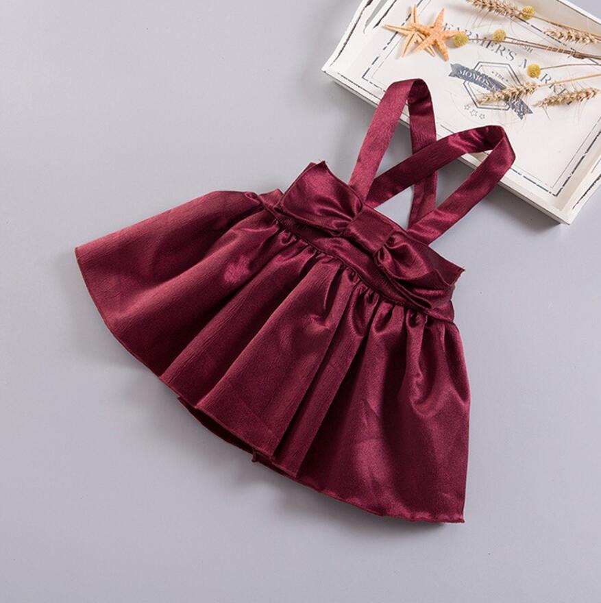 * Thick satin mini skirt jumper in burgundy. * Big bow front. * Zipper and button back with adjustable button straps. * Fits true to size. * Shirt is NOT included.